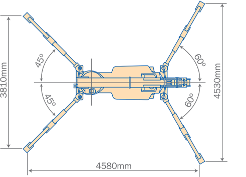 Maks utpakkete dimensjoner | 4 multi-posisjonsbokstype med stengeventiler (lengde) 4580 mm x (front) 4530 mm x (bak) 3810 mm | Framdriftssystem Drev