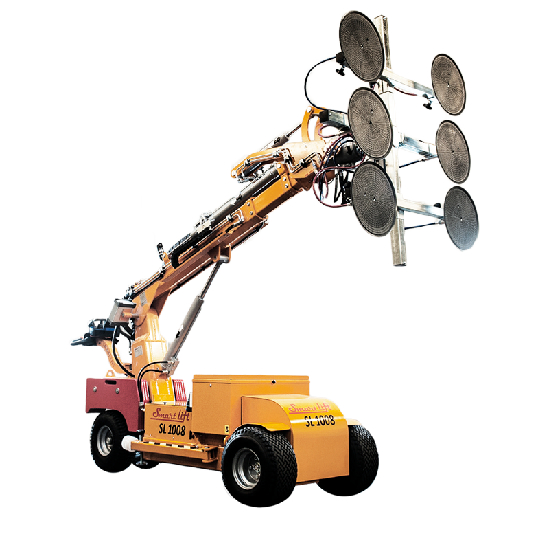 Armforlengelse: 1.66 M /66 IN.Løftehøyde: 4.4 M /173 IN.SL 1008 Outdoor er vår mest avanserte vinduslift. Den kombinerer maksimal løftekraft og avanserte funksjoner. Store fasadeelementer håndteres enkelt og presist ved hjelp av det multifunksjonelle, roterende staget. Med glassliften får du med trådløs fjernkontroll som styrer alle funksjoner og tilbyr bevegelsesfrihet for operatøren. Glassliften har også et display som gir operatøren full oversikt over batteristatus, vakum-nivå og faktisk lift belastning. Heisen har et proporsjonalt hydraulisk system som gjør det mulig for føreren å kontrollere armen ekstremt nøyaktig slik at små justeringer vil føre til små bevegelser av selvet staget, og armen. SL 1008 Outdoor (Glasslift) er utstyrt med brede tvillingdekk for å forhindre at maskinen setter seg fast. Denne liften er også forhjulsdrevet og utstyrt med brede dekk for å sikre unik stabilitet når du kjører med full belastning. Flaggskipet til Smart Lift-linjen som også har hydraulisk stag-rotasjon.